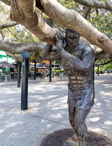 El titán metálico no solo cumple una función estética: también ayuda a apuntalar una de las ramas más pesadas del gomero, que con el paso del tiempo —y sus casi tres siglos de vida— comenzó a inclinarse. Algunas de sus ramas ya contaban con soportes de madera, pero la incorporación de esta escultura cambió por completo la escena: el soporte se transformó en una obra de arte pública, en un diálogo perfecto entre naturaleza y creatividad.