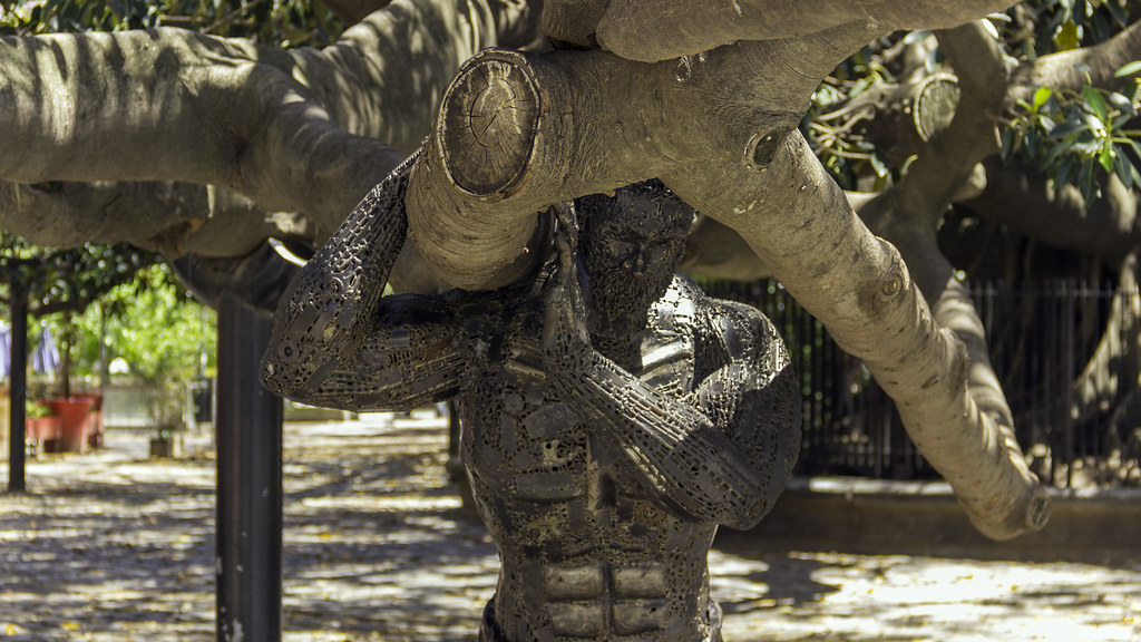 Fanático de los motores desde chico —una pasión que heredó de su madre, quien además le dio la idea de hacer esta obra—, Arbiza reunió más de tres mil partes de autos de las décadas del 50 y 60: bujías, chasis, engranajes, frenos. Las soldó y ensambló una a una durante doce meses de trabajo hasta dar forma a este Atlas moderno, que en lugar de cargar el mundo sostiene una rama de árbol. La escultura pesa unos 300 kilos y fue donada por el artista a la Ciudad de Buenos Aires en 2014.