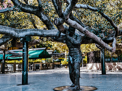 El gomero y el Atlas se complementan como si siempre hubieran estado juntos. Uno crece, el otro resiste. Uno vive de savia, el otro de acero. Juntos forman una postal tan porteña como única: un árbol centenario sostenido por un titán hecho de autos antiguos, en el corazón de Recoleta.