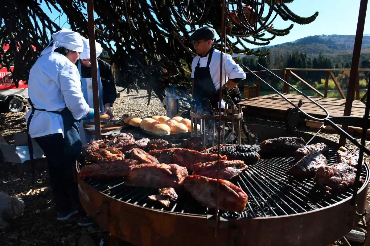 Este año, más de 30 chefs se sumaron al evento. El fuego fue protagonista, como siempre: corderos enteros girando en asadores, truchas recién pescadas cocidas al hierro y hongos patagónicos en mil formas.