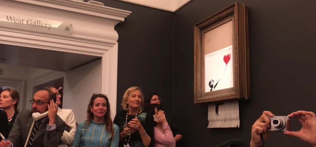 En 2018 llevó esa idea al extremo: su obra Girl with Balloon se autodestruyó parcialmente en plena subasta en Sotheby’s. La escena dio la vuelta al mundo. Fue, al mismo tiempo, una performance y una crítica directa al mercado del arte.
