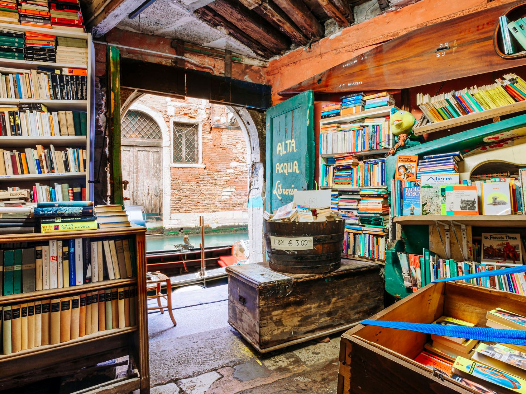 En la ciudad de los canales, Acqua Alta transforma el acto de entrar a una librería en una experiencia única, donde los libros conviven con el entorno y el azar es parte del recorrido.