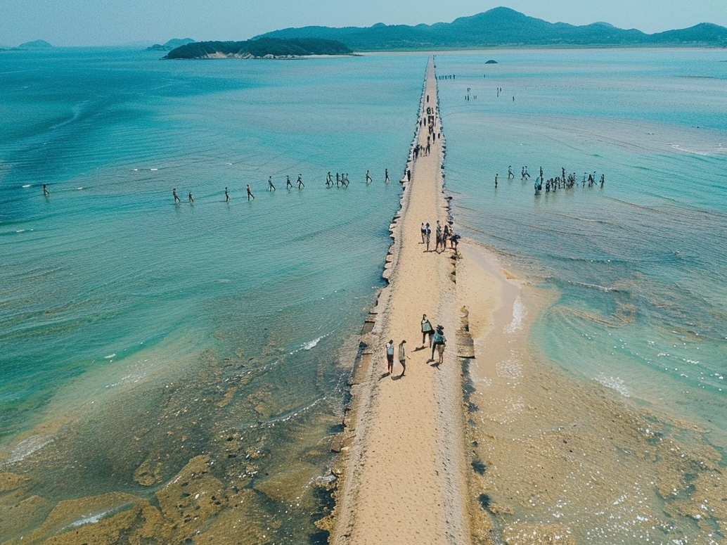 Hay un momento en el sur de Corea del Sur en el que el mar deja de ser mar. El agua retrocede, el fondo aparece y, donde antes había olas, surge un camino de tierra húmeda que conecta dos islas. Durante unas pocas horas, lo improbable se vuelve real: miles de personas caminan por el lecho marino.