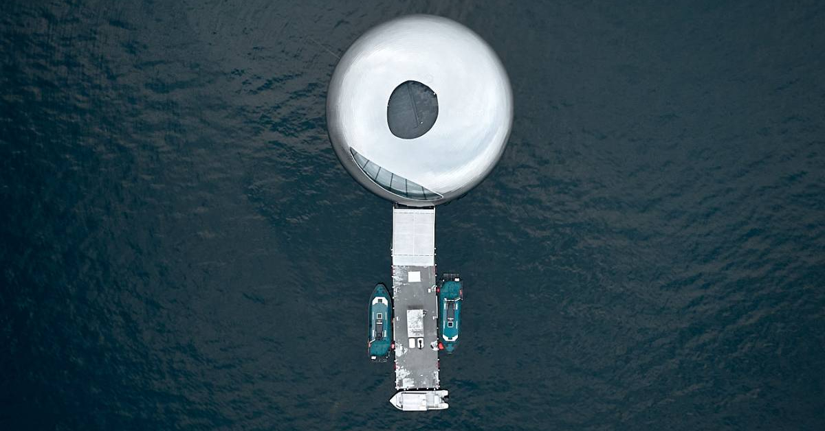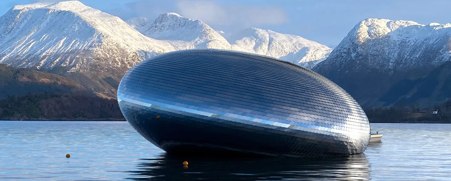La construcción, diseñada por Kvorning Design, imita la forma de un gigantesco ojo de pez y se presenta como una de las estructuras flotantes más ambiciosas del planeta. Con 25 metros de diámetro, más de mil metros cuadrados y más de 1.200 toneladas de peso, este coloso metálico juega con reflejos y brillos que cambian según la luz del día, integrándose al paisaje del fiordo y, al mismo tiempo, destacándose como un objeto de diseño futurista.