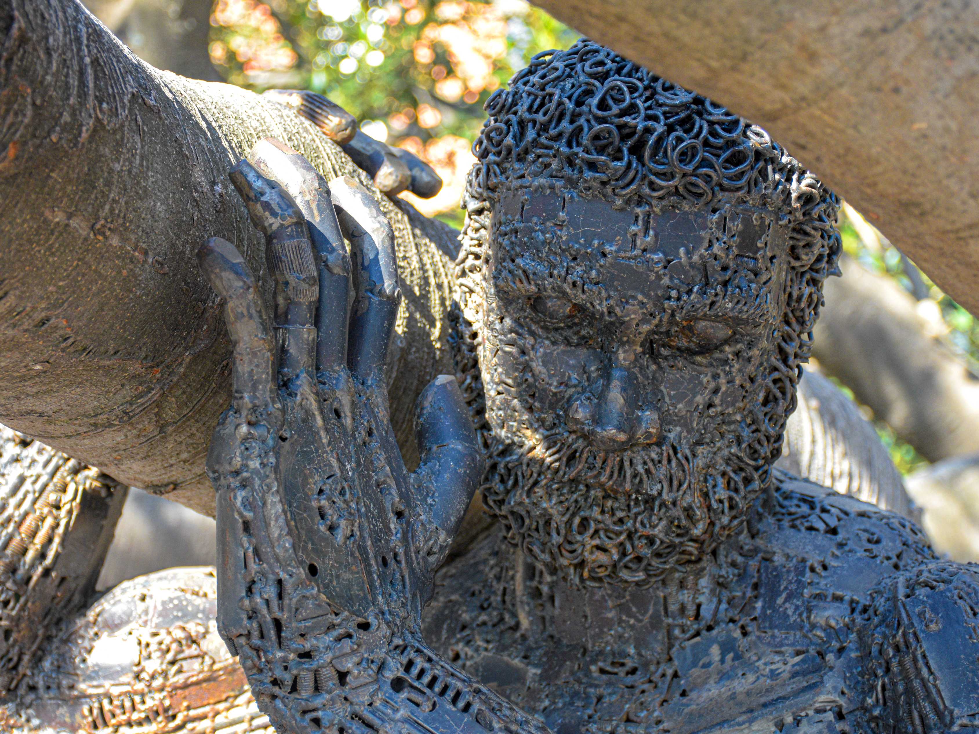 Frente al bar La Biela, un árbol con casi tres siglos de vida comparte escena con una escultura hecha de autos antiguos. Dos leyendas porteñas que, de algún modo, se sostienen entre sí.