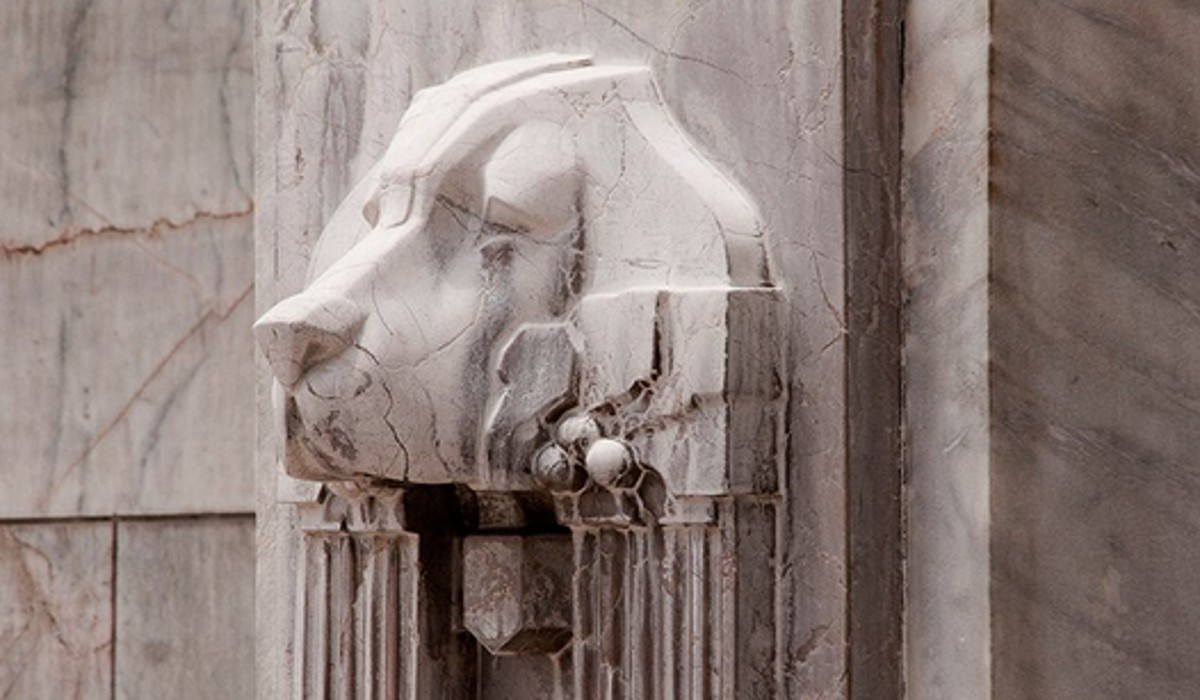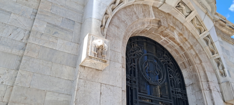 Hizo construir una escultura con la cabeza de su perrita para integrarla al edificio como homenaje. No como un monumento separado, sino como parte del lenguaje ornamental del Palacio.