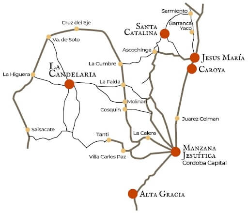 - Manzana Jesuítica (Córdoba Capital): El punto de partida. Incluye la iglesia de la Compañía, la Universidad y el Colegio Nacional de Monserrat.